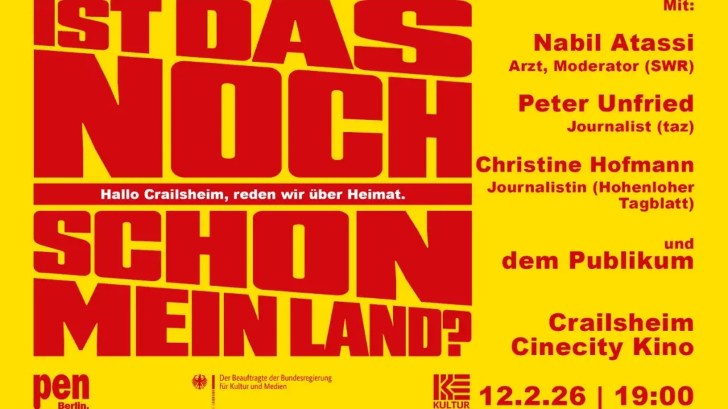 Im Vorfeld der Landtagswahl lädt PEN Berlin zur Gesprächsreihe „Hallo Baden-Württemberg, reden wir über Heimat“ ein. Am Donnerstag macht die Reihe Station in Crailsheim. Im Cinecity diskutieren der SWR1-„Leute“-Moderator Nabil Atassi und der taz-Futurzwei-Chefredakteur Peter Unfried die Frage „Ist das noch/schon mein Land?“. Mit dabei sind außerdem Deniz Yücel und Aron Boks von PEN Berlin. Anders als bei klassischen Podiumsdiskussionen ist das Publikum aktiv in das Gespräch eingebunden.